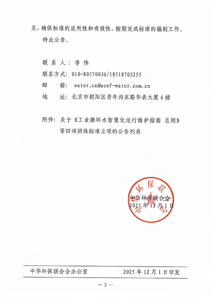 立项公告|中华环保联合会关于《工业循环水智慧化运行维护指南 总则》等四项团体标准立项的公告